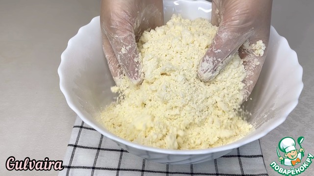 В миску с мукой добавляем соль, разрыхлитель, ванильный сахар, сахарную пудру и все хорошо перемешиваем. Добавляем холодное сливочное масло и все перетираем в мелкую крошку.