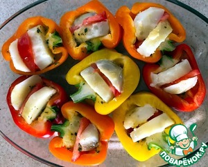 а) Равномерно распределить яичную смесь по всем половинкам перцев и затем добавить картофель с помидорами.