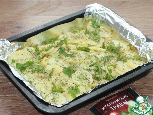 10. Выкладываем картофель. Посыпаем приправой для овощей и мелко порубленной зеленью, перемешиваем.