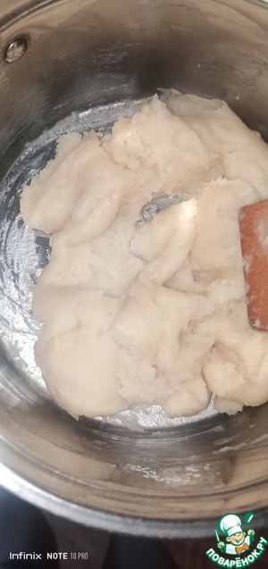 После закипания, высыпать просеянную муку и активно все вымешивать лопаткой. Масса должна собраться в комочек.