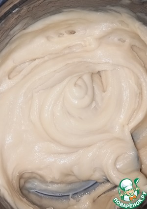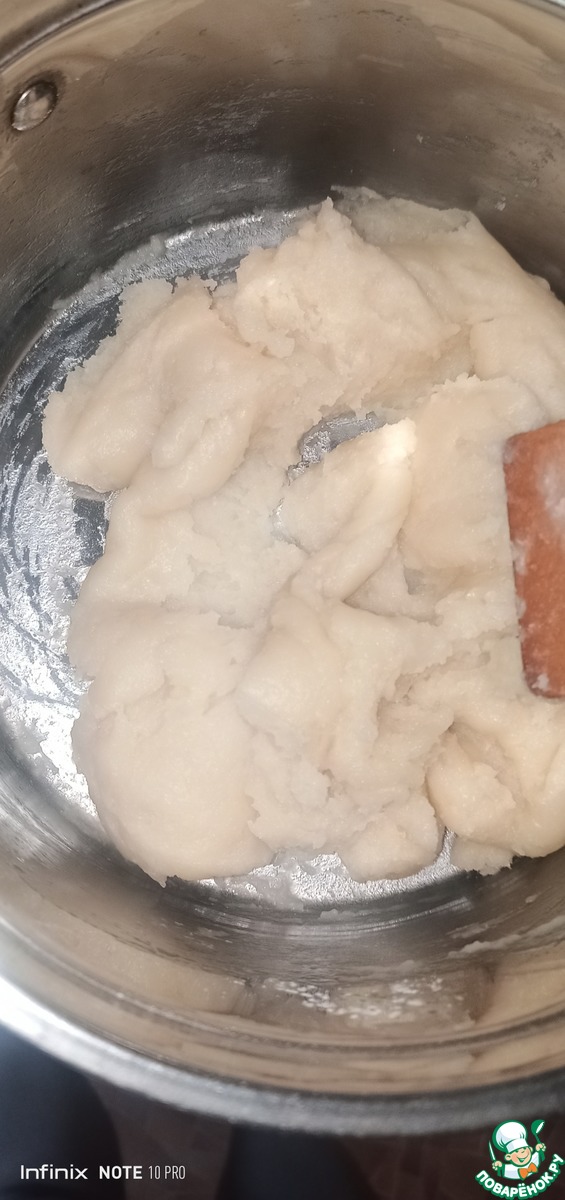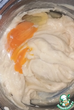 После того, как на дне начал образовываться бархатистый слой, снять с огня массу и дать остыть. После чего вводим в массу по одному яйцу и сразу активно мешаем.