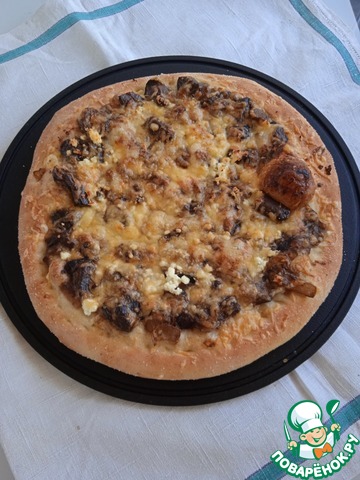 Когда я увидела эту пиццу, сразу поняла, что она моя. Всё делала по рецепту. Грибы белые только у меня были сушёные. Я их замочила, а потом отварила, дальше по рецепту. Размером поменьше сделала, конечно убавила ингредиенты и для теста, и для начинки в соответствии с размером моей формы для выпечки пиццы. Чтобы представить приблизительно размер пиццы моей, форма моя -D-26 см. В тесто муки для неё я беру 200 г.