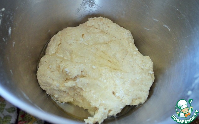 Влить воду, замесить тесто, добавить масло, вымесить до однородности и эластичности.