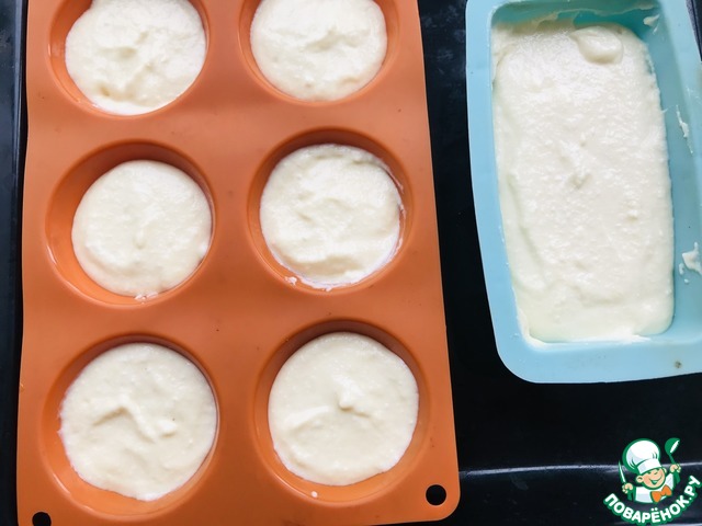Заполняю силиконовые формочки для кексов на 2/3. У меня форма для 6 кексов, поэтому я использую ещё прямоугольную силиконовую форму. Лучше использовать силиконовые формы, т. к. в этих творожниках нет масла и они могут прилипнуть. Если нет силиконовых формочек, то металлические или бумажные формы хорошо смазать маслом.