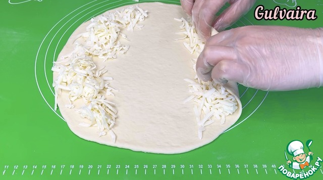 Далее тесто делим на 2 части. Каждую раскатываем. С двух сторон по краю выкладываем сыр и скатываем к центру. Хорошо защипывая края.