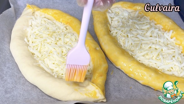 Готовые хачапури перекладываем на противень. В центр выкладываем сыр. Края смазываем желтком. И отправляем в заранее разогретую духовку при 250 гр на 7-10 минут.