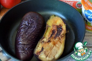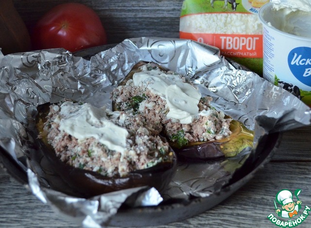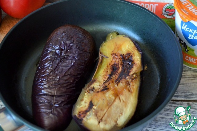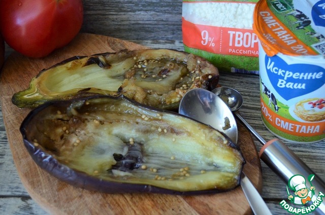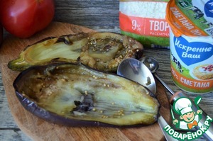Смазать сверху оставшейся сметаной и поместить в духовку, не забудьте положить в духовку и мякоть баклажана в фольге.