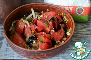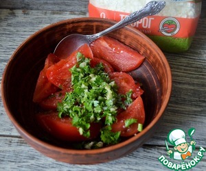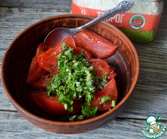 Помидор вымыть, нарезать, добавить рубленую зелень с чесноком, посолить.
