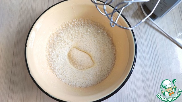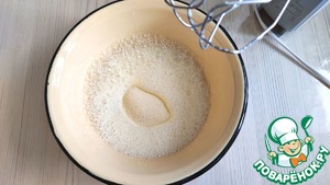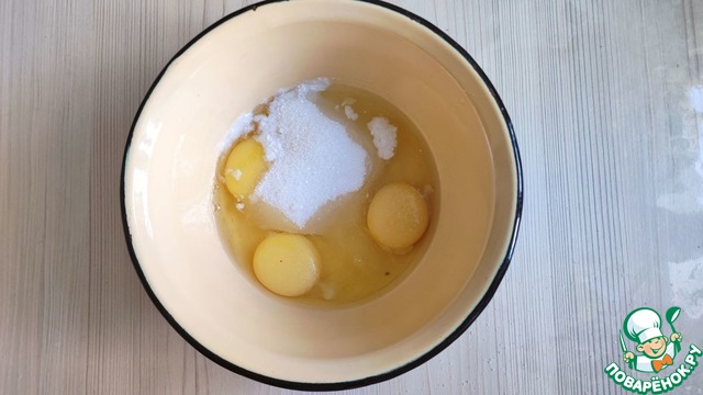В миску добавить яйца (3 шт.), добавить сахар (80 гр.), ванилин (1 ч. л. без горки) и соль (1 щеп.). Смесь взбить.