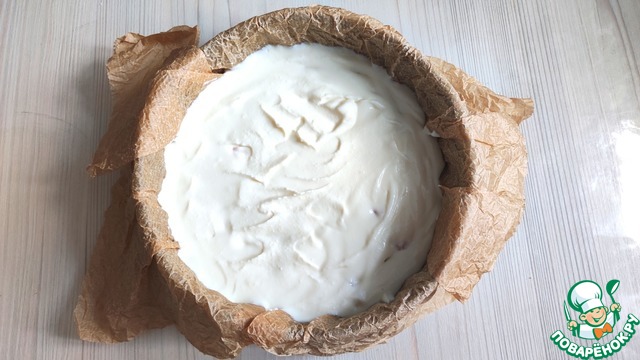 Форму выстелить пергаментом. Добавить творожное тесто в форму. Форму отправить в разогретую до 180С духовку. Выпекать примерно 40-50 мин. Далее духовку выключить. Запеканку не вынимать в течение 15-20 мин.