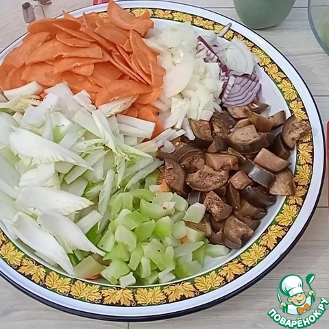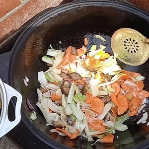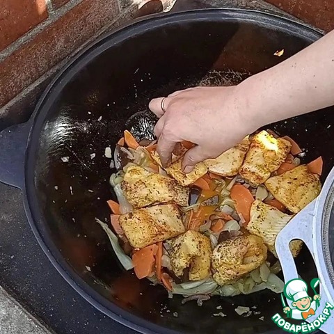 • Потом кладем в казан овощи (капусту в самом конце за 5 минут до готовности), солим, перчим и жарим примерно 20 мин.
