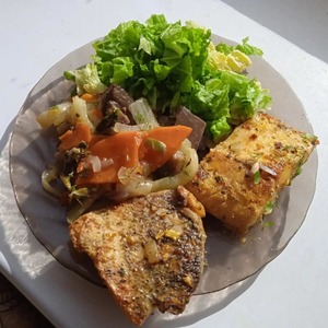 • На тарелку кладем часть свежей пекинской капусты, овощи, а сверху кусочки карася. Вкусное блюдо из простых продуктов готово!!! Приятного аппетита!