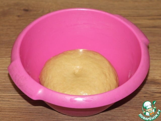 5. Собираем тесто в ком и округляем. Смазываем миску и тесто растительным маслом. Закрываем миску пленкой и ставим в теплое место для подъема теста в 2,5 раза, часа на 1,5-2. Через час тесто обминаем, закрываем и оставляем до вторичного подъема.