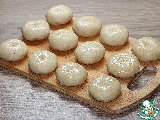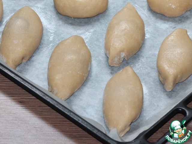 14. Ставим противень в теплое место, минут на 30 или до увеличения пирогов в 2 раза. Я ставлю противень в разогретую до t 40 С духовку. Если нет такой температуры в духовке, выставляем t 100 С, открываем дверку духовки и на нее ставим противень. Минут 10, прогреваем заготовки с одной стороны, затем переворачиваем противень и еще 10 минут.