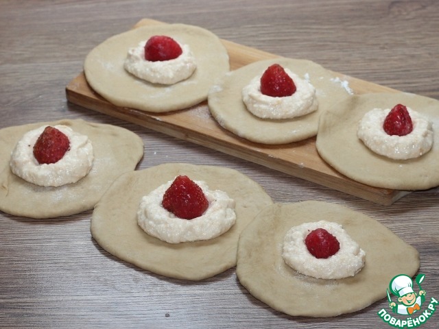 Очень ароматные, сладкие пирожки на хлебном тесте с творожной начинкой и клубникой.