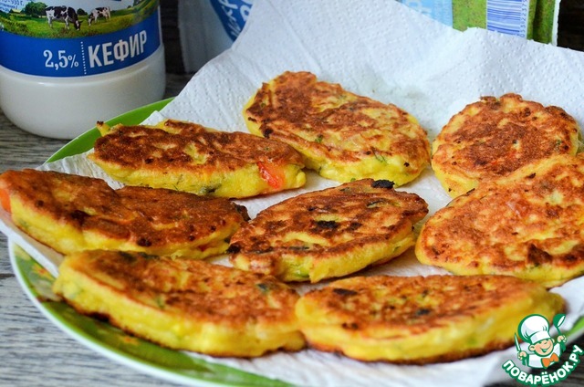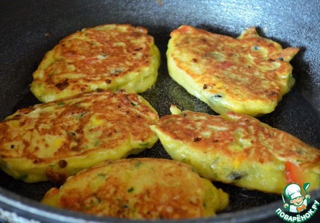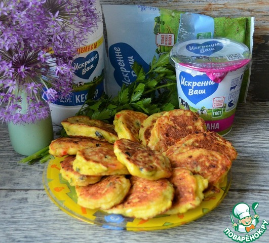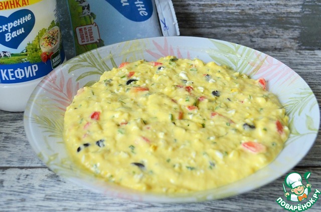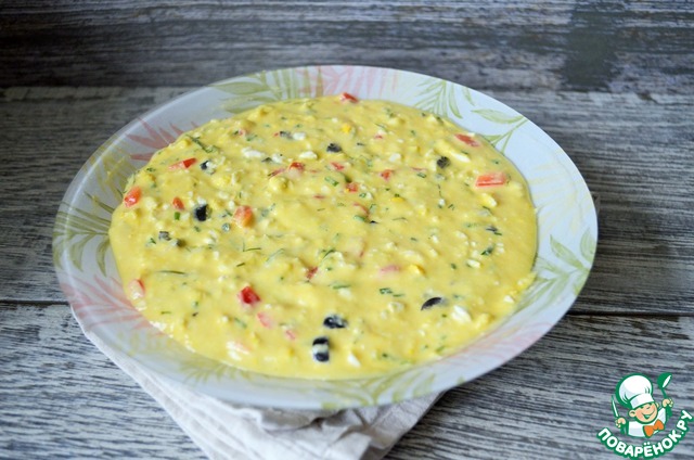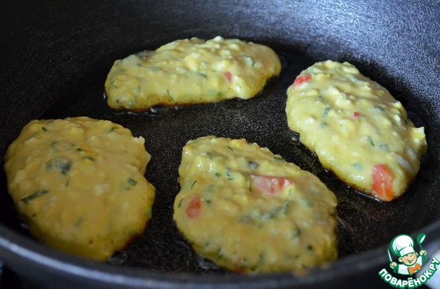 Вкусные оладушки, сытные и пикантные - с творогом и варёным яйцом, болгарским перцем и оливками. Рекомендую.