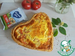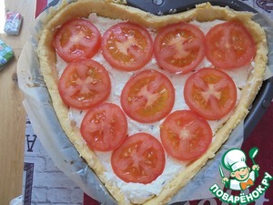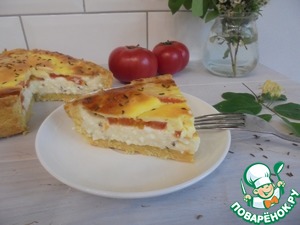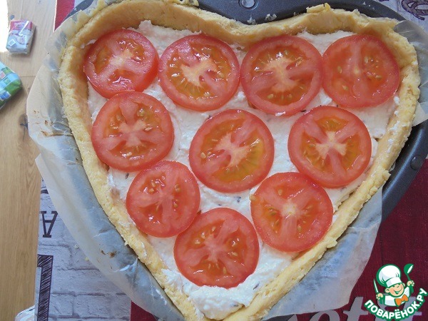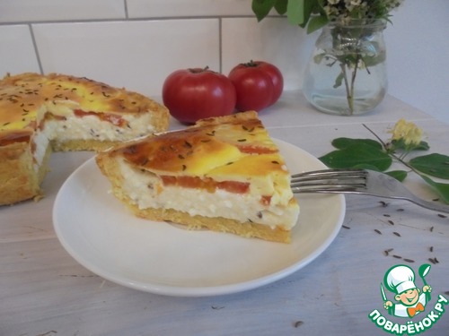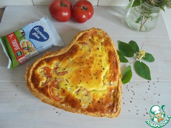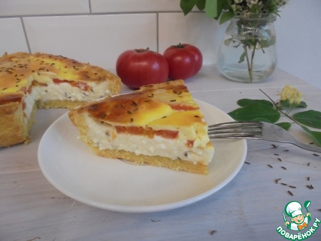 Нежное песочное тесто, пикантная творожная начинка с тмином, слой томатов и сметанная заливка. Отличная выпечка с творогом для любителей несладкой выпечки.