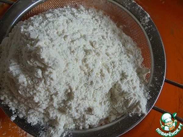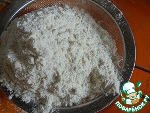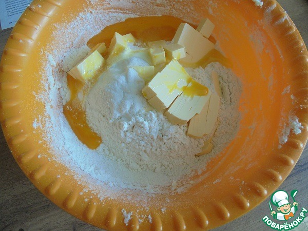К просеянной муке добавить соль по вкусу, разрыхлитель для теста. Сливочное масло нарезать кубиками. Добавить одно яйцо. Перемешать руками в крошку.
