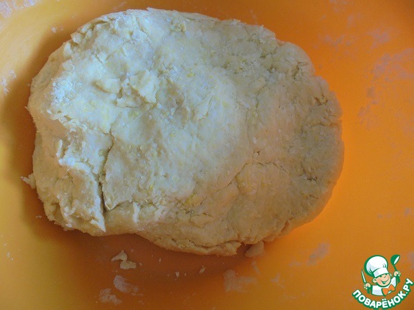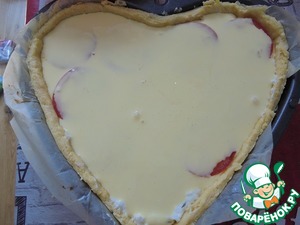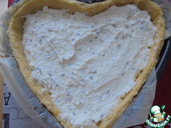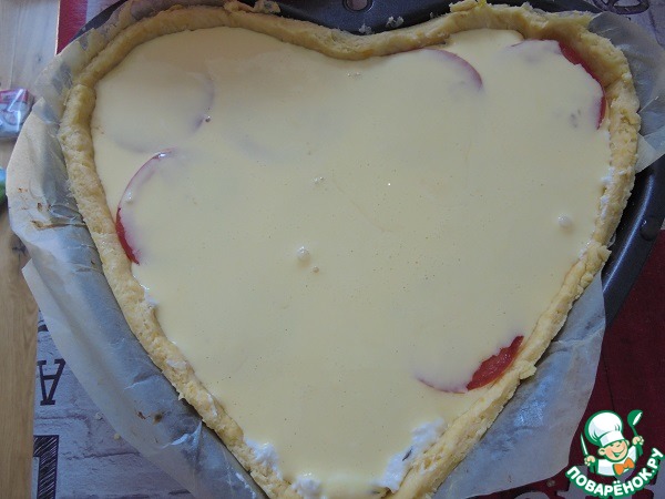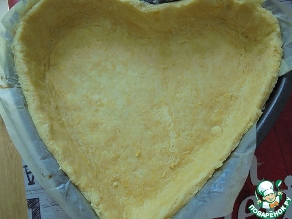 Тесто вынуть из холодильника, раскатать в пласт толщиной 5-6 мм, выложить в форму для запекания, края теста обрезать по краю формы.