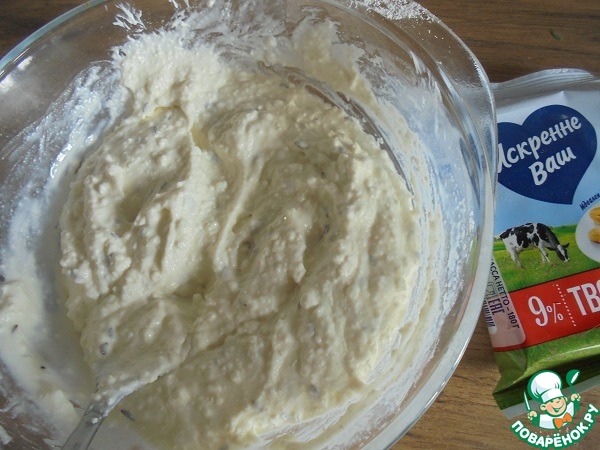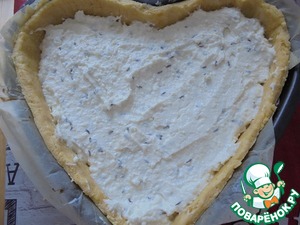 Для начинки к творогу добавить 2 ст. л. топленого сливочного масла, соль по вкусу, кукурузный крахмал и 1 ч. л. тмина. Перемешать, добавить сливки, перемешать до однородной массы. Творожная начинка готова.
