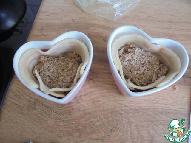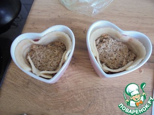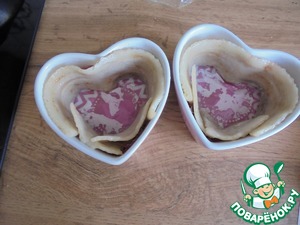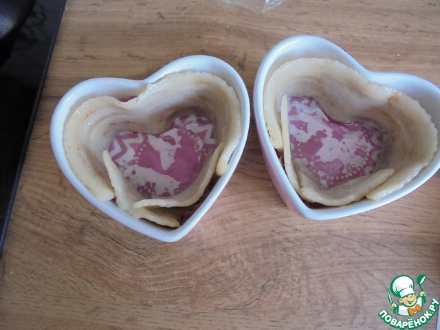 В маленькие керамические формы ( 2 шт.) выложить бумажные формочки для кекса. Стенки выложить обжаренными полосками бекона (лучше взять целые полоски, у меня- часть кусочками).