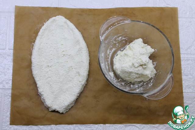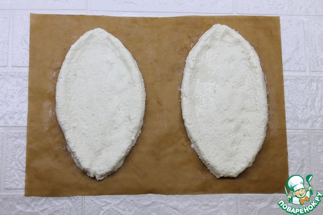 Тесто разделить на две равные части. Оно получается не плотным, липнет к рукам. На ХОРОШЕМ пергаменте или силиконовом коврике для выпечки, мокрыми руками сформировать лодочку, формируя небольшие бортики. Я сначала просто в руках леплю продолговатую котлетку (как киевская), а потом уже на пергаменте её расплющиваю и, аккуратно разминая пальцами, растягиваю до нужного мне размера.
