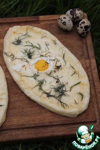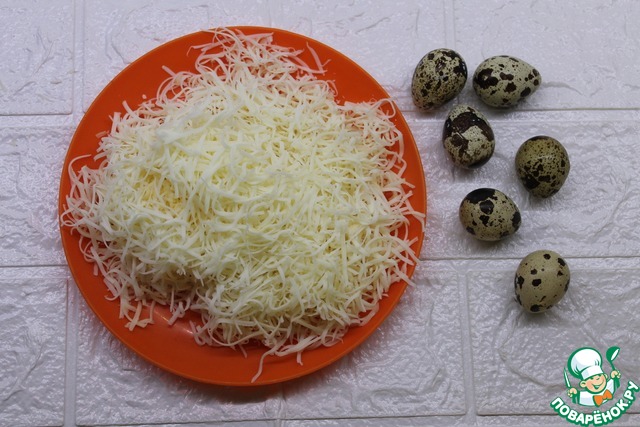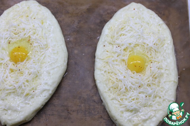 Спустя 10 минут вынуть лодочки, сделать проколы вилкой и разложить по 50 грамм сыра в каждую. В серединке сделать углублениt и вбить перепелиное яйцо. Отправить в духовку ещё на 5 минут.