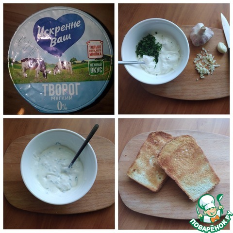 Вместо творожного сыра я сегодня буду использовать мягкий творог. Порублю мелко чеснок и веточку базилика. Отправлю в творог, посолю по вкусу и всё соединю. Такой творог мало чем будет отличатся от творожного сыра. Куски пшеничного хлеба я подсушу в тостере до красивого золотистого цвета. Если нет тостера, то подсушите хлеб на сухой сковороде с обеих сторон.