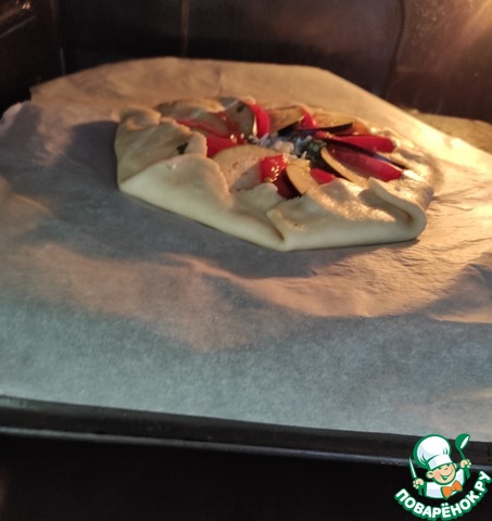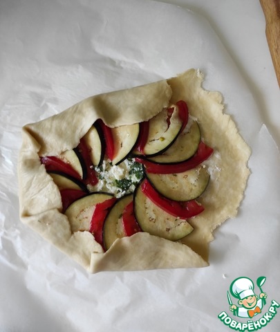 Сверху теста выложить начинку, а затем овощи, чередуя их по цвету. Защипать края, оставив начинку в открытом виде.