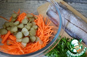 Вымыть и натереть морковь тонкой соломкой или на крупной тёрке. Слегка посолить и перетереть. Огурчики нарезать тонкими колечками, смешать.