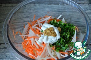 Зелень нарубить, добавить с луком (без уксуса) к овощам, заправить майонезом и горчицей.
