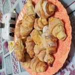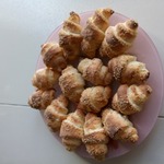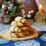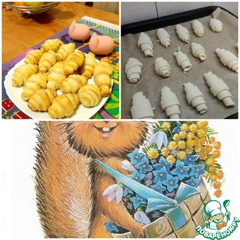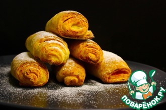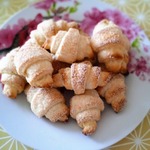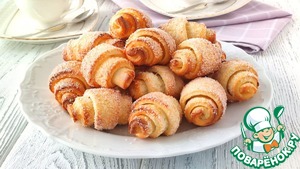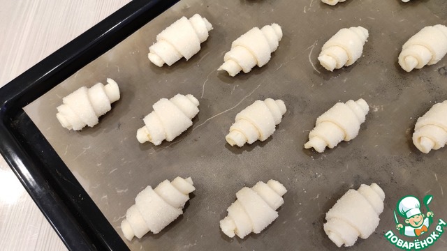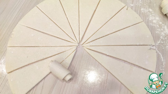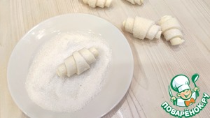 Далее тесто раскатать в пласт толщиной примерно 3-5 мм., присыпать сахаром и еще раз прокатать скалкой сахарный слой. При помощи кулинарного резца-колесика нарезать полоски, как показано на фото. Свернуть рогалики.