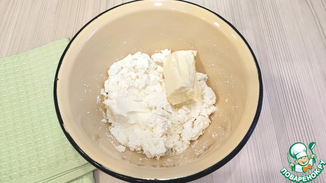 Перед тем как приступить к приготовлению творожного теста, хочу обратить внимание на ряд моментов. Лучше всего для приготовления печенья подходит творог жирностью 5-9%. В рецепте использовался творог ТМ "Искренне Ваш" (9%). Предварительно творожное зерно следует отжать через марлю, сложенную в 2-3 слоя и пробить при помощи погружного блендера.