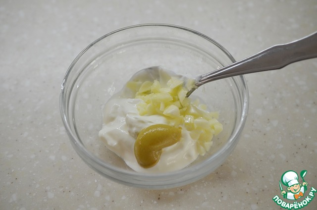 Сметану смешайте с горчицей и нарезанным чесноком.