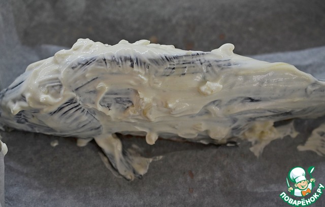 Карпа выложите на противень, обильно смажьте сметанным соусом.