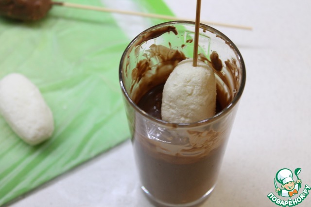 Пока заготовки охлаждаются, подготовить глазурь. Для этого орехи промыть, обсушить бумажным полотенцем и немного обжарить на сухой сковороде, дать остыть и измельчить. Шоколад наломать в высокий узкий стакан и растопить в микроволновке импульсами по 10 секунд, каждый раз хорошо перемешивая. Затем влить масло в растопленный шоколад, перемешать, всыпать орешки и ещё раз хорошо перемешать.