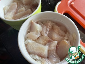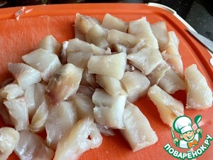 Филе трески нарежьте небольшими кусочками, посолите и поперчите, сбрызните соком лимона.