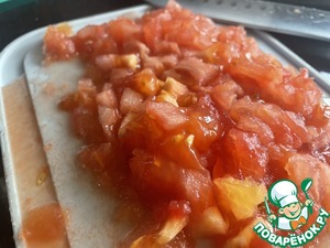 Помидоры залейте кипятком на 1 мин. (предварительно сделав неглубокий крестообразный надрез), затем обдайте холодной водой и снимите кожицу. Нарежьте мелкими кубиками.