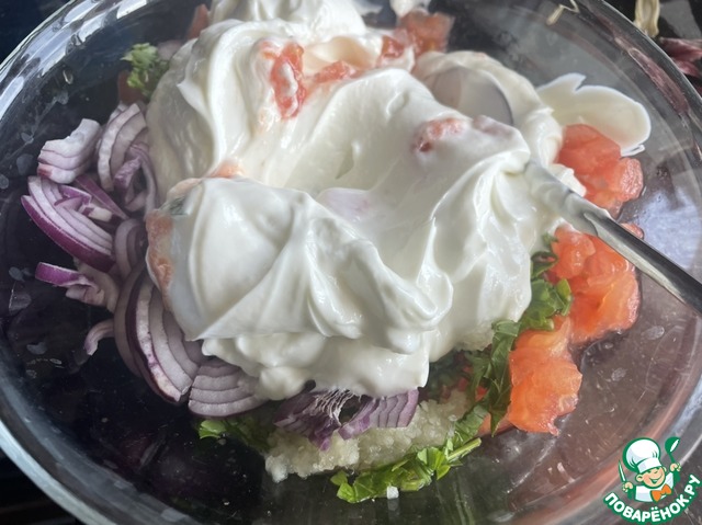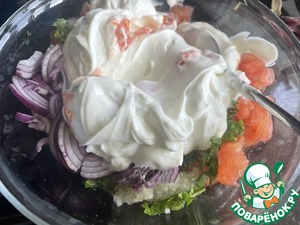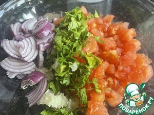 Смешайте помидоры, лук, рубленную зелень и выдавленный прессом чеснок.