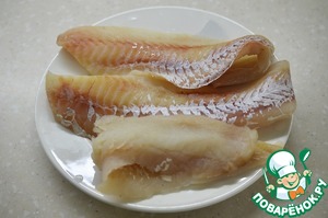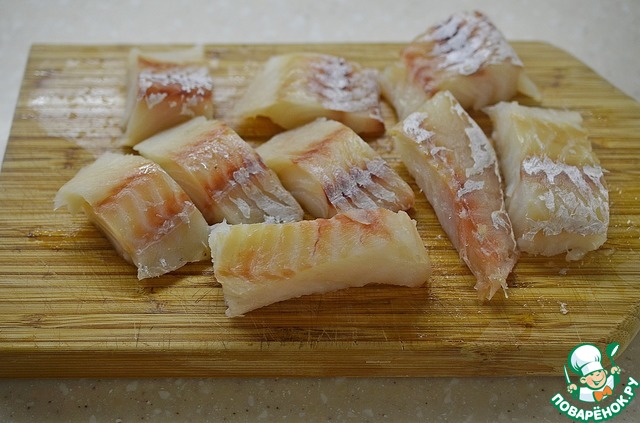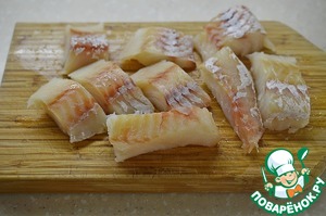 Нарежьте рыбу на небольшие кусочки прямоугольной формы.