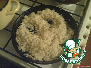 Пока лук и морковь тушатся, берем 1,5 стакана риса и промываем его хорошо. Слегка поджариваем рис в сковородке на топленом масле.