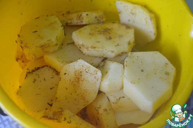 Картофель вымыть, очистить, нарезать кружочками. Перемешать со специями для картофеля.