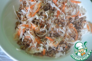 Гречневую крупу заранее отварить, соединить с квашеной капустой.