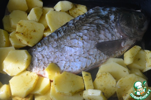 Нафаршировать рыбу, выложить на смазанный маслом противень. Вокруг выложить картофель.