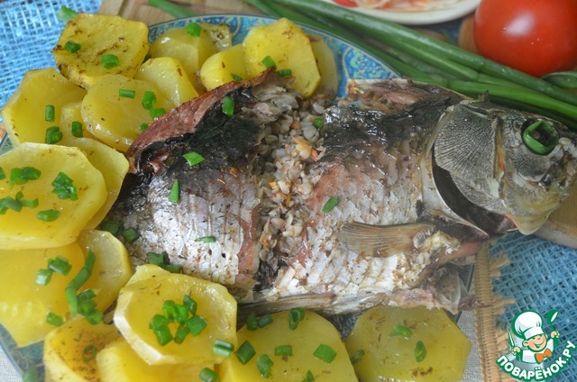 В теплом и уютном доме всегда пахнет домашней едой. Попробуйте порадовать своих близких - приготовив такую фаршированную, ароматную рыбку. Рыба фаршированная гречкой с квашеной капустой, по краям запечённый картофель. Никого не оставит равнодушным.