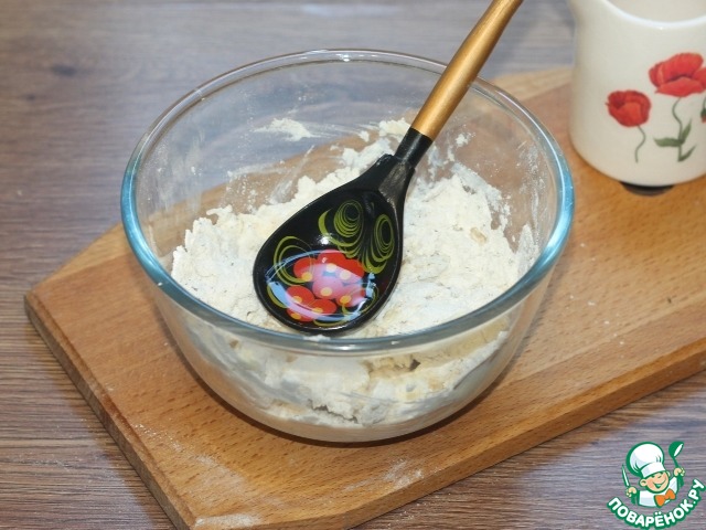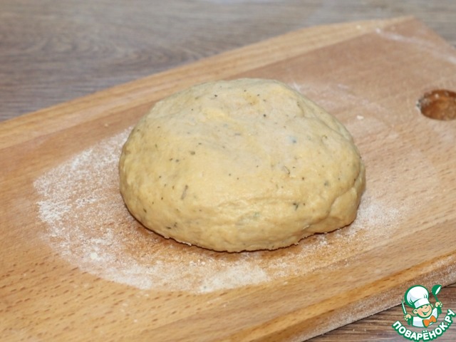 4. Подпыляем столешницу мукой и выкладываем тесто. По 1 ст. ложке вмешиваем остальную муку (5 ст. л.). Собираем тесто в ком и округляем.