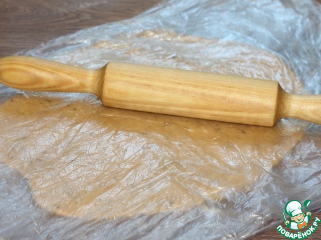 5. Кладем тесто на прозрачный пакет и накрываем другим пакетом. Слегка раскатываем тесто скалкой, толщиной 7 мм. Кладем тесто на разделочную доску и убираем в холодильник, минут на 15.