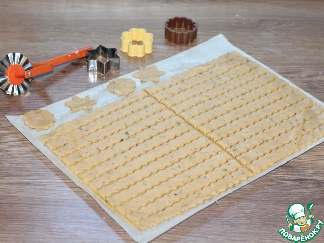 6. Подпыляем столешницу мукой и раскатываем охлажденное тесто в пласт, толщиной 3 мм. Вырезаем из теста закусочное печенье.