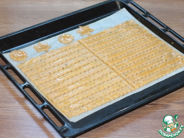 7. Кладем на противень пекарскую бумагу и смазываем растительным маслом. Раскладываем на противне закусочное печенье. Взбиваем яйцо с щепоткой соли и смазываем печенье.