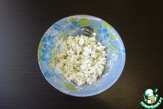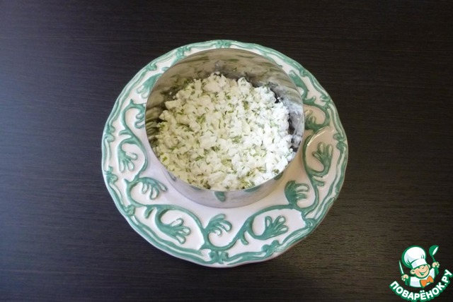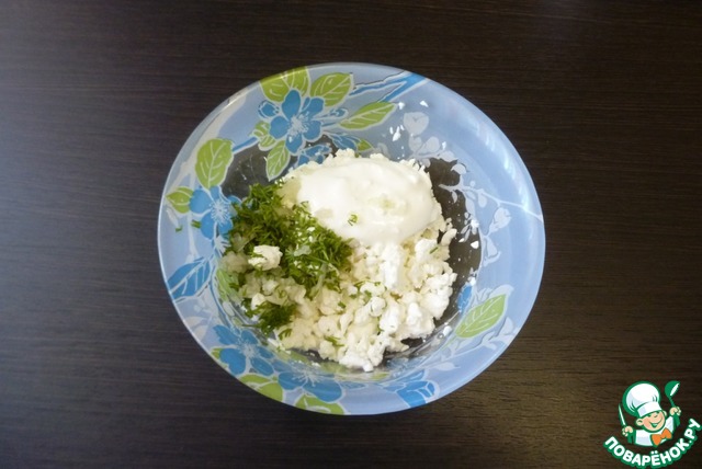 Для первого слоя смешать творог, немного сметаны, выдавить чеснок и измельчить укроп. Посолить.